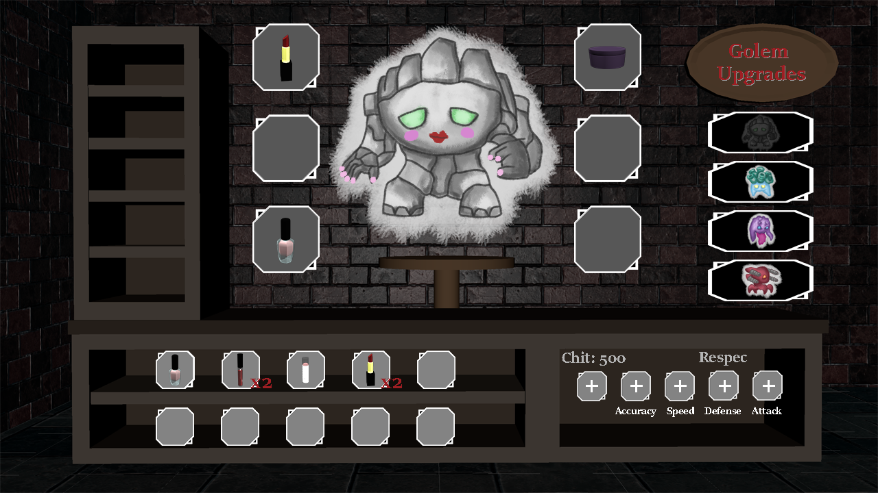 Makeup is an aspect in the real world that is taken very seriously. People use makeup to change enhance and/or change things about themselves they don’t like. In Rouge-Lite, we wanted to create the opposite feeling. This is why the creatures that use the makeup in the game aren’t really humans, but the golems. This was to help create a more light-hearted feel to the gameplay as well as the real world product.